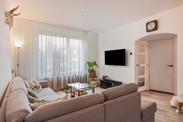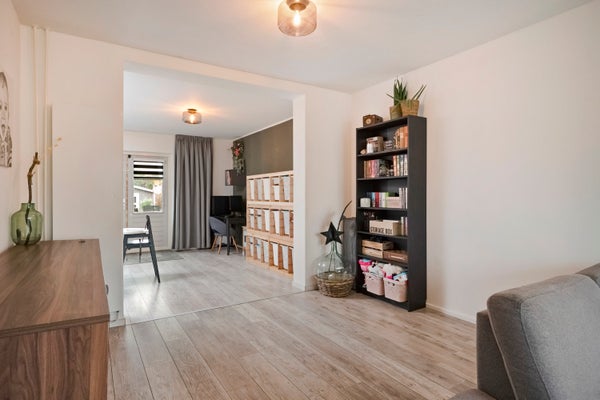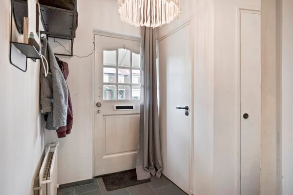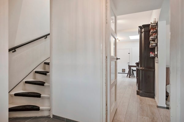 Je komt de woning binnen in een charmante hal, die toegang biedt tot de woonkamer, de trap naar de eerste verdieping en de vernieuwde meterkast.