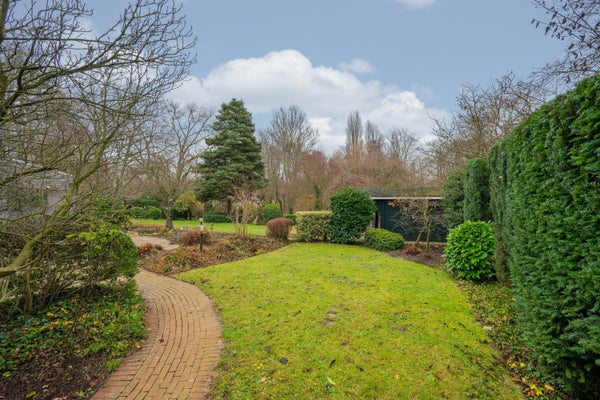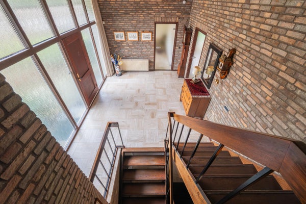 Het pad in de voortuin en de oprit leiden naar het schitterende perceel. Het pad komt uit bij de voordeur met overkapping, die toegang geeft tot de ruime ontvangsthal met garderobe.