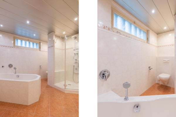 • Moderne badkamer met ligbad, douche, wastafel en vloerverwarming.