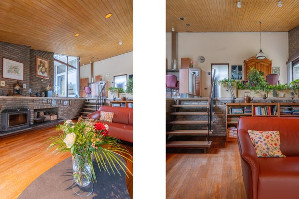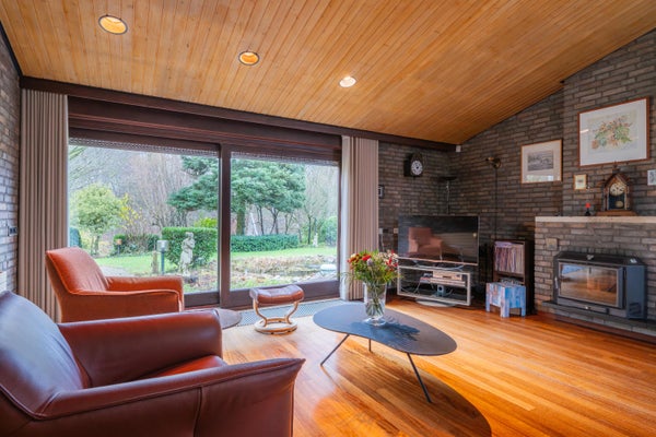 De ruime woonkamer is lager gelegen en via een trap te bereiken. In de woonkamer ligt een parketvloer. Grote raampartijen bieden een schitterend uitzicht op de tuin rondom de bungalow. De ramen en schuifdeuren naar de tuin zijn voorzien van hardhouten kozijnen, dubbel glas en rolluiken. In de woonkamer zorgt een gezellige houtkachel voor extra comfort tijdens koelere dagen.