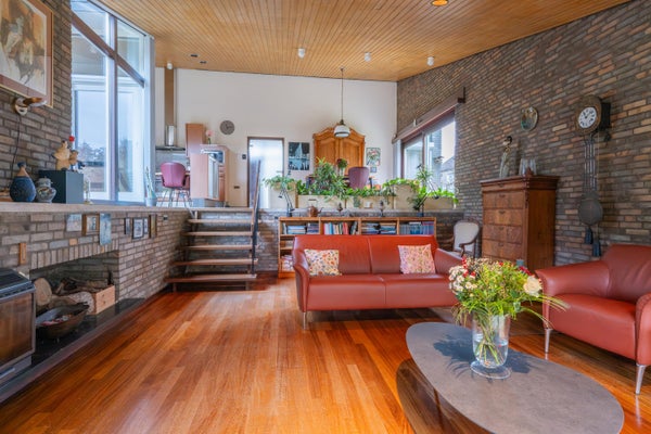 De begane grond beschikt over een ruime en lichte woonkamer met houtkachel, een open keuken met eetkamer en grote raampartijen die zorgen voor veel natuurlijke lichtinval.