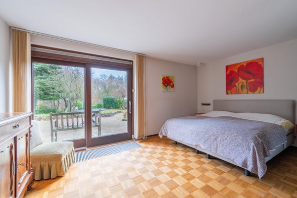 In de slaapkamer ligt een parketvloer. Ook hier bevindt zich een grote schuifpui met hardhouten kozijn, dubbel glas en rolluik, die toegang biedt tot een terras in de tuin. De slaapkamer beschikt over een grote wandkast.