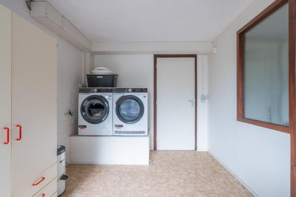 In de wasruimte ligt een novilonvloer. Hier bevinden zich de witgoedaansluitingen. De wasmachine en droger worden op een verhoging geplaatst, zodat uw rug minder wordt belast.