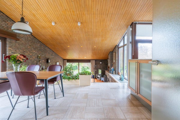 Het eetkamergedeelte aangrenzend aan de keuken, biedt ruimte voor het plaatsen van een grote eettafel met stoelen. Ook in dit gedeelte bevindt zich een grote schuifpui naar de zijkant van de woning/tuin toe.