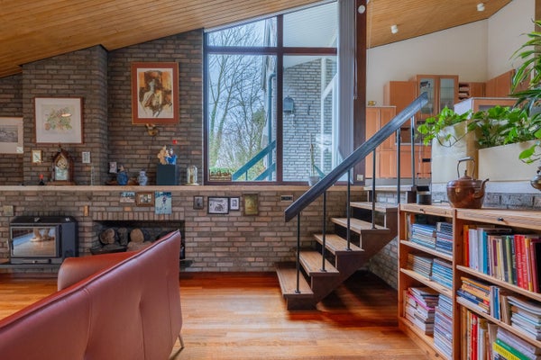 • Lichte woonkamer met tuinzicht en houtkachel.