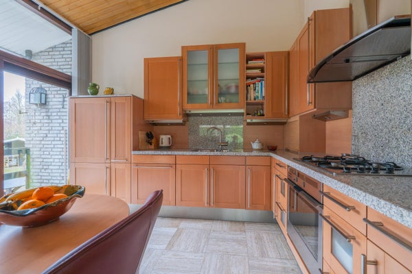 De keukenopstelling bestaat uit een 4-pits gasfornuis met afzuigkap erboven, een magnetron, een elektrische oven, een vaatwasser, een koelkast en een granieten werkblad met spoelbak. In de keuken zelf is tevens ruimte voor een kleine eethoek voor twee personen. De grote schuifpui bevindt zich in het keukengedeelte en biedt toegang tot en zicht op de prachtige achtertuin.