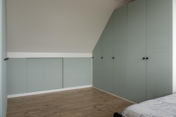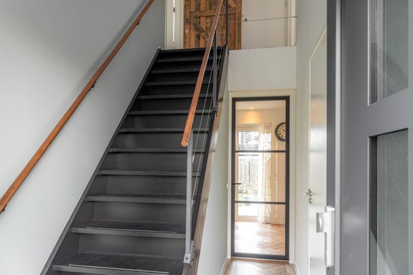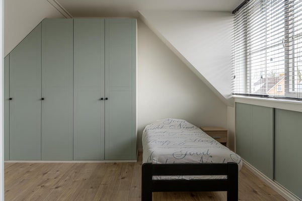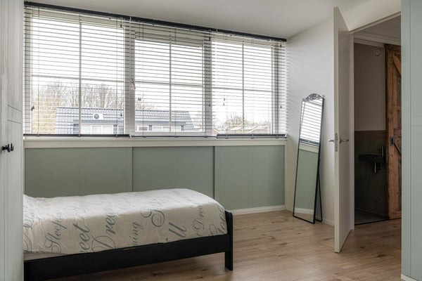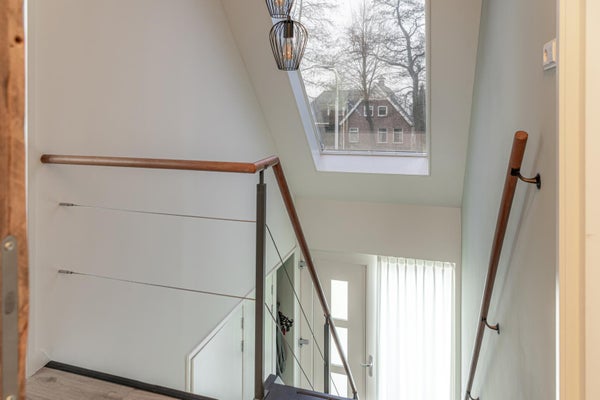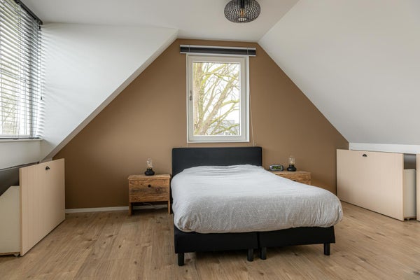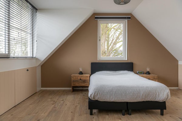 Via de fraaie trap met vide en een groot raam erboven bereik je de verdieping. Op de overloop bevindt zich een toilet en is de cv-ketel netjes weggewerkt in een kast. Verder zijn hier twee ruime slaapkamers, beide voorzien van vaste kasten en lades op wieltjes in de knieschotten, waardoor de ruimte optimaal wordt benut. Ook op deze verdieping is het afwerkingsniveau hoog en verzorgd.