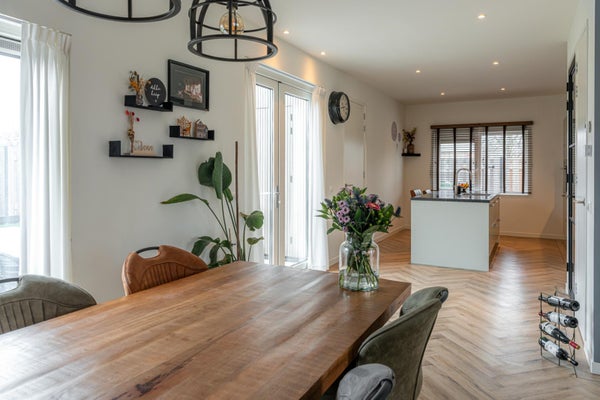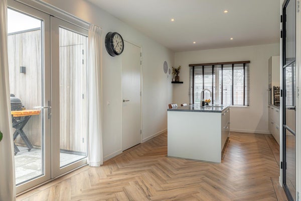 Rechtdoor in de hal loop je de ruime keuken in, die direct aansluit op de eetkamer. Aan de voorzijde van de woning bevindt zich de woonkamer. De keuken is royaal opgezet en beschikt over een spoeleiland waaraan je ook gezellig kunt ontbijten of gewoon een bakje koffie doen. Uiteraard is de keuken voorzien van diverse inbouwapparatuur. Onder de trap bevindt zich een praktische bergkast.
