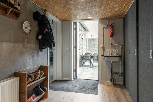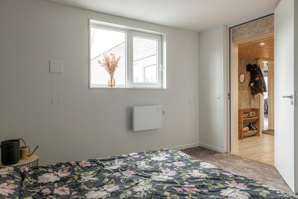 Aansluitend aan de keuken ligt de bijkeuken met een deur naar het terras en de tuin. Hier zijn de was- en droogmachine netjes weggewerkt achter een kastenwand met schuifdeuren. Naast de bijkeuken bevindt zich de slaapkamer op de begane grond van circa 14 m².