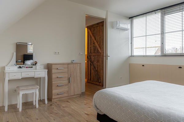 Via de fraaie trap met vide en een groot raam erboven bereik je de verdieping. Op de overloop bevindt zich een toilet en is de cv-ketel netjes weggewerkt in een kast. Verder zijn hier twee ruime slaapkamers, beide voorzien van vaste kasten en lades op wieltjes in de knieschotten, waardoor de ruimte optimaal wordt benut. Ook op deze verdieping is het afwerkingsniveau hoog en verzorgd.