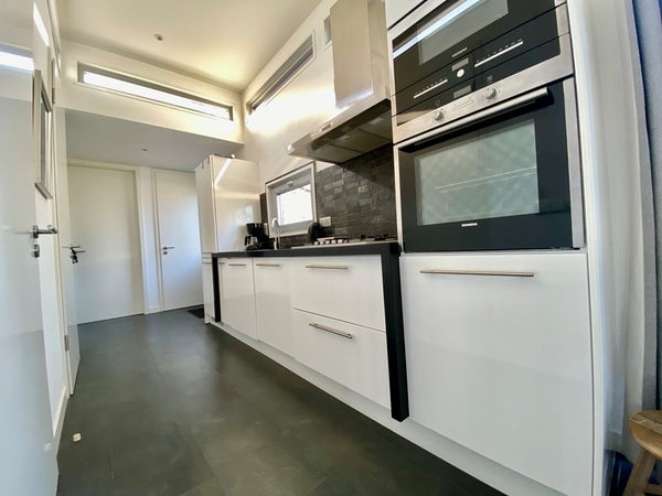 De moderne open keuken in wandopstelling is uitgerust met een 4-pits gasfornuis met wokbrander, afzuigkap, combimagnetron, oven, koelkast, diepvries en vaatwasser.