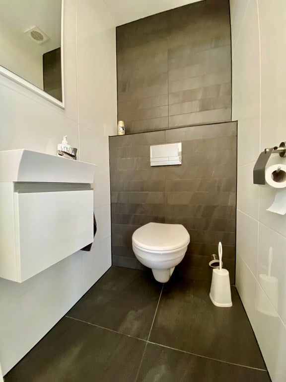 Daarnaast is er een separate toiletruimte met fonteintje en meubel.