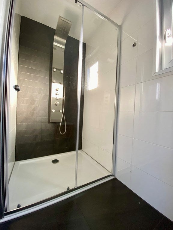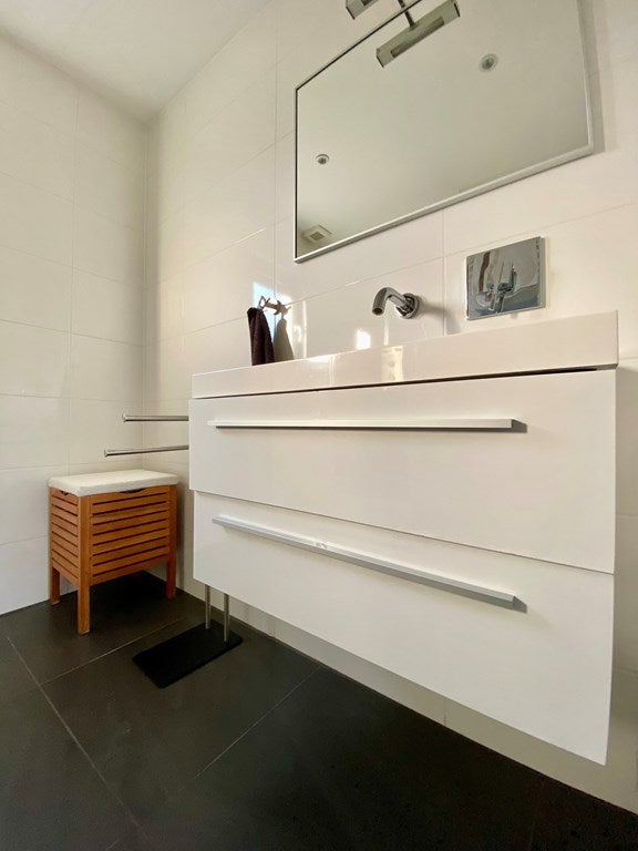 De moderne badkamer is uitgerust met een inloopdouche met massagefunctie en een wastafelmeubel.