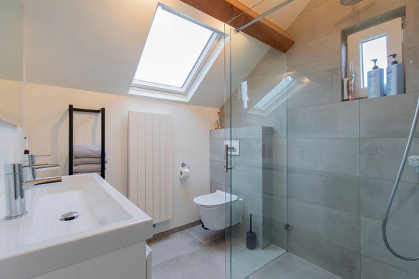 De badkamer is compact maar functioneel ingericht en voorzien van douche, wastafel en toilet.