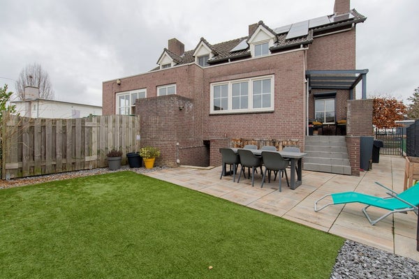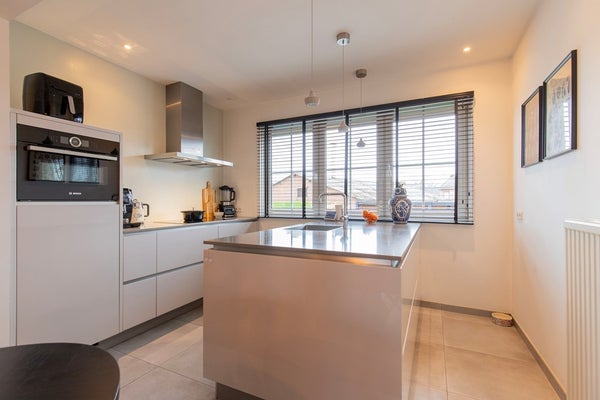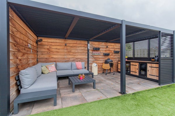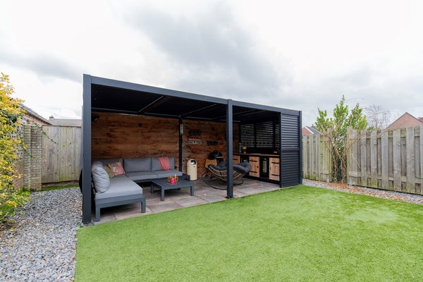 Vanuit de keuken is de overdekte buitenruimte bereikbaar, ideaal als beschutte zitplek of praktische doorgang naar de tuin.