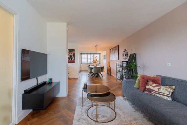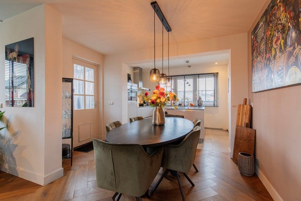 De woonkamer loopt door naar de eetkamer, gelegen aan de achterzijde van de woning, met direct contact naar de keuken. De keuken is opgesteld aan de achterzijde en voorzien van een functionele opstelling met voldoende werk- en bergruimte.