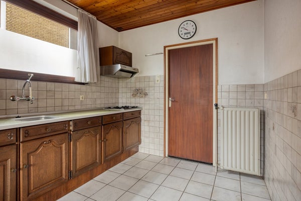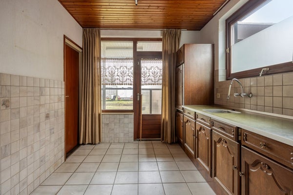 De gesloten keuken is opgesteld in rechte opstelling en voorzien van houten fronten en verouderd apparatuur. Vanuit de keuken is er toegang tot de serre aan de achterzijde. De serre biedt extra leefruimte en vormt een mooie verbinding met de tuin met de mogelijkheid deze te vervangen voor een uitbouw.
