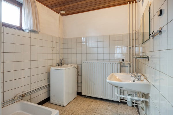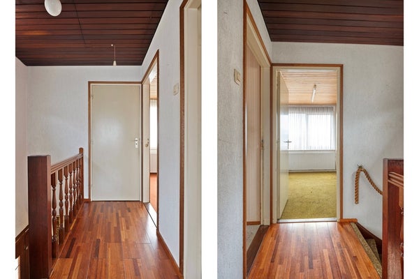 De overloop geeft toegang tot drie slaapkamers en de badkamer. De slaapkamers zijn praktisch van formaat en voorzien van grote ramen, wat zorgt voor prettig daglicht. De badkamer is eenvoudig uitgevoerd en voorzien van douche en wastafel. Ook deze ruimte dient gemoderniseerd te worden.
