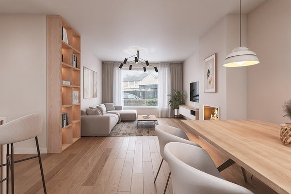 Via de entree bereik je de hal met toiletruimte, meterkast en trapopgang naar de eerste verdieping. Vanuit de hal kom je in de woonkamer met veel natuurlijke lichtinval dankzij de grote raampartijen aan voor- en achterzijde.
