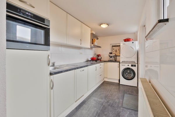 De halfopen keuken (ca. 8,5 m²) is voorzien van een keukenblok met o.a. koelkast, vaatwasser, combi oven-magnetron, 5-pits gasfornuis en afzuigkap. Tevens bevinden zich hier de aansluitingen voor wasmachine en droger en is er een loopdeur naar de tuin. De gehele begane grond is afgewerkt met een laminaatvloer.