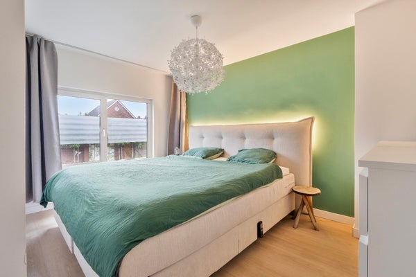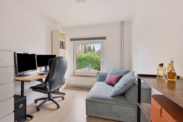 De overloop geeft toegang tot drie slaapkamers (ca. 7,5 m², 8 m² en 11 m²), waarvan één momenteel in gebruik is als kleedkamer. De volledig betegelde badkamer is uitgerust met een inloopdouche met thermostaatkraan, wastafel, radiator en buitenraam.