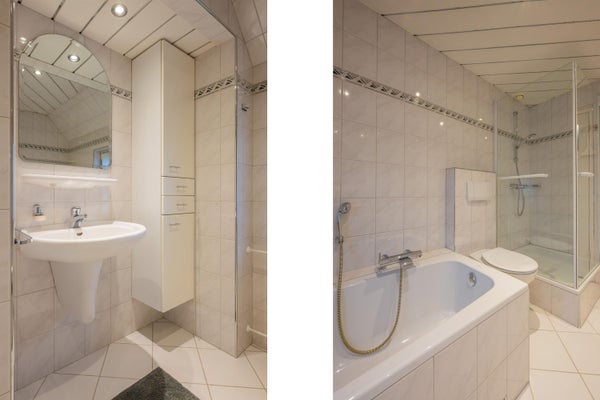 De geheel betegelde badkamer bestaat uit een ligbad, een douche, een wastafel en een toilet. Het verlaagd plafond is voorzien van inbouwspots. Bovendien is de badkamer voorzien van mechanische ventilatie.