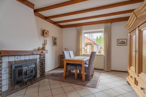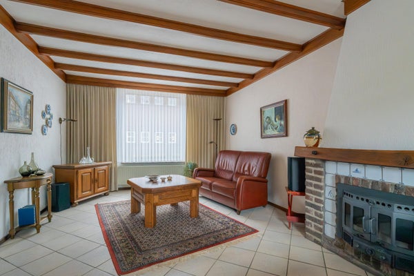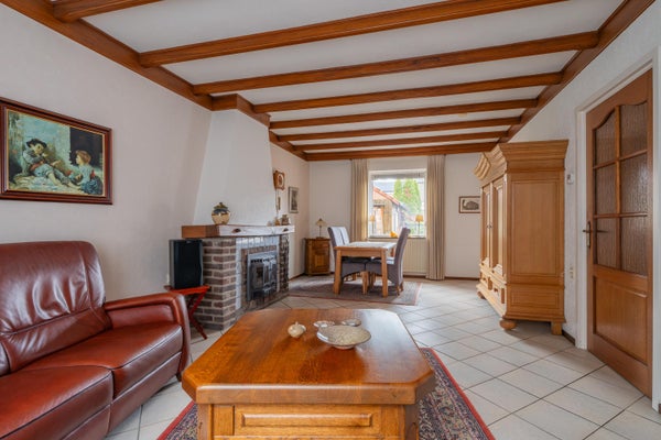 In de woonkamer ligt de tegelvloer vanuit de ontvangsthal doorgelegd. De woonkamer is ruim genoeg voor het plaatsen van een eetkamertafel met stoelen. In de woonkamer bevindt zich een houtkachel die zorgt voor extra warmte. De hardhouten kozijnen zijn voorzien van dubbel glas en deels elektrische bedienbare en deels handbediende rolluiken.