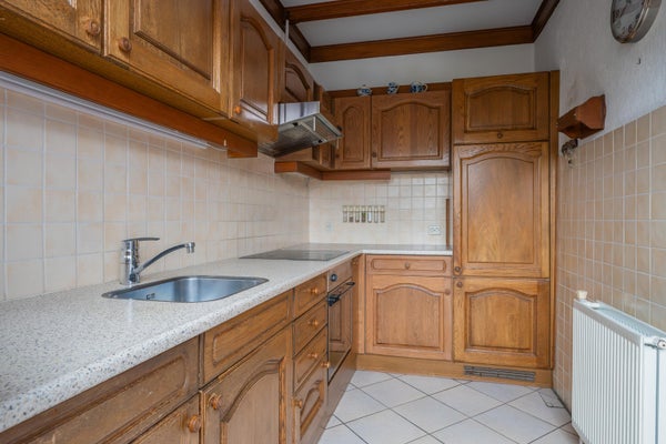 De keuken met tegelvloer bestaat uit een keramische kookplaat met afzuigkap erboven, een oven, een koelkast, een 1 persoons vaatwasser en een werkblad met spoelbak.