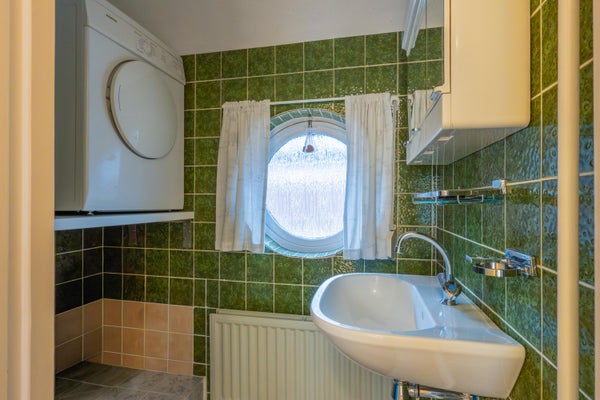 De voormalige badkamer doet nu dienst als wasruimte. Hier bevinden zich de witgoedaansluitingen en is er nog een extra wastafel aanwezig.
