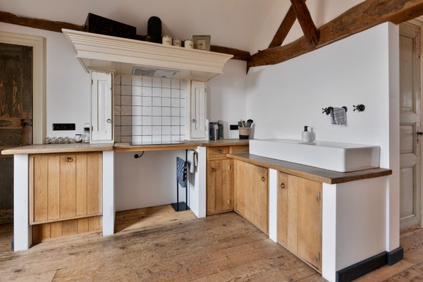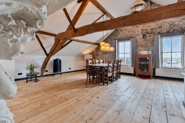 • Tweede verdieping: een indrukwekkende woonkamer van ca. 67 m² met houten balken en open haard. De aangrenzende landelijke keuken (ca. 30,5 m²) is compleet uitgerust en beschikt over een praktische bijkeuken.