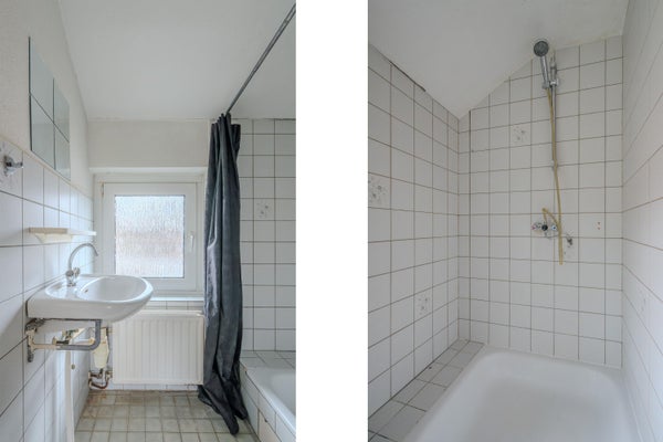 De geheel betegelde badkamer bestaat uit een douche en een wastafel.