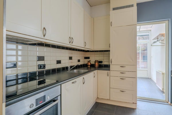 In de keuken ligt eveneens een tegelvloer. De keukenopstelling bestaat uit een inductie-kookplaat met afzuigkap erboven, een vaatwasser en een werkblad met spoelbak.