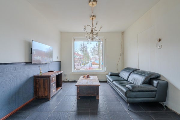 Middels de open keuken komt u in de uitgebouwde woonkamer. De woonkamer is voorzien van een tegelvloer. De raampartijen aan de voorzijde van de woonkamer en in de serre zorgen voor natuurlijke lichtinval. De aluminium kozijnen met dubbel glas zijn voorzien van rolluiken. In de woonkamer beschikt u over voldoende ruimte voor het plaatsen van een eettafel met stoelen.