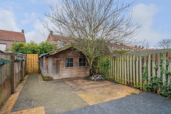 In de achtertuin bevindt zich een houten berging. Deze berging is handig voor het stallen van tuinmeubels of tuingereedschap.
