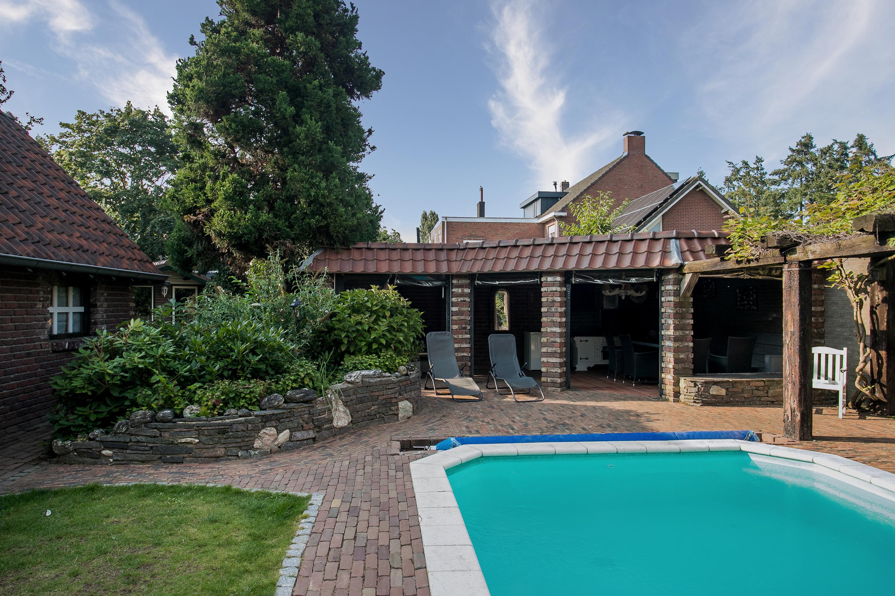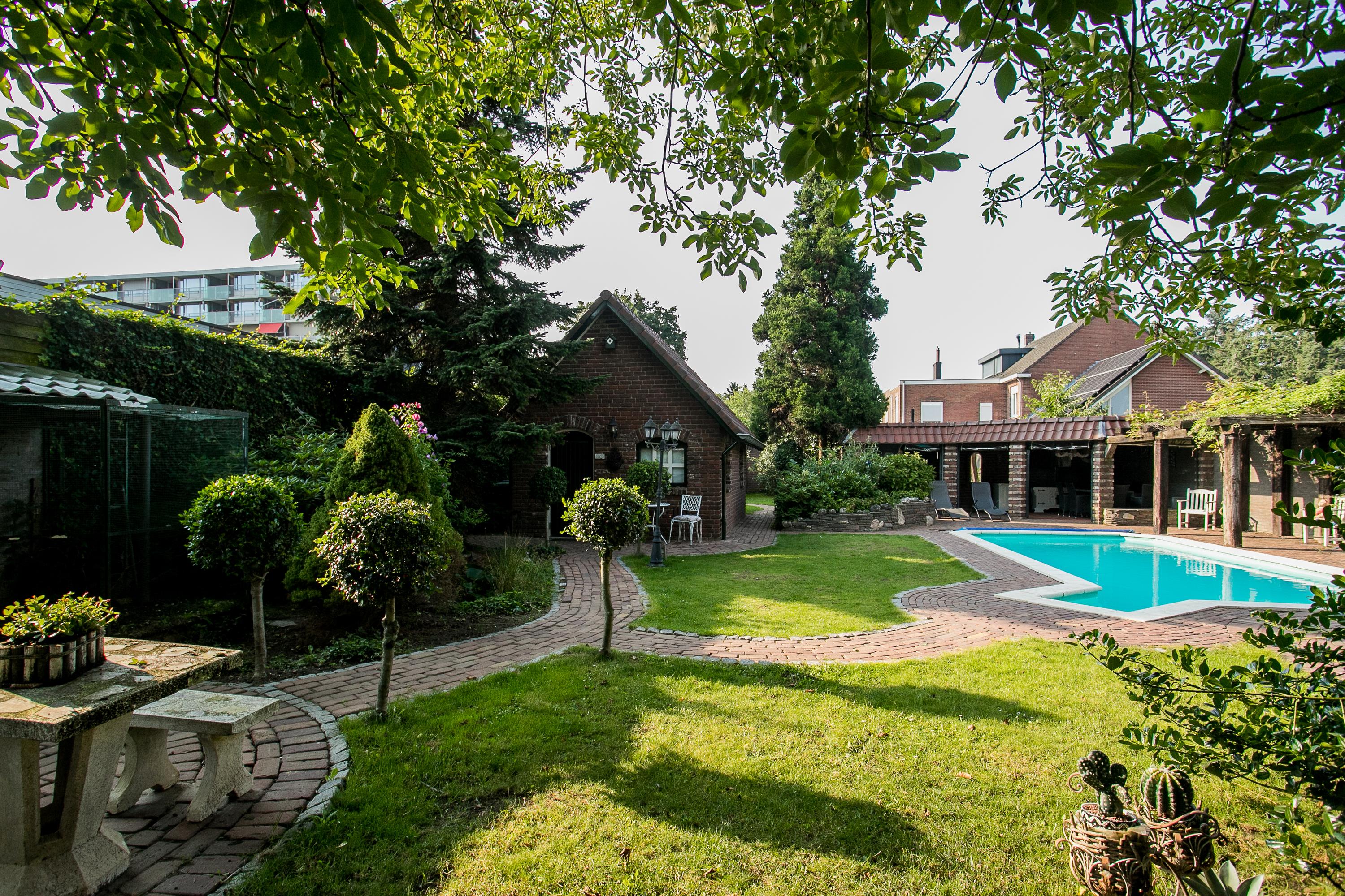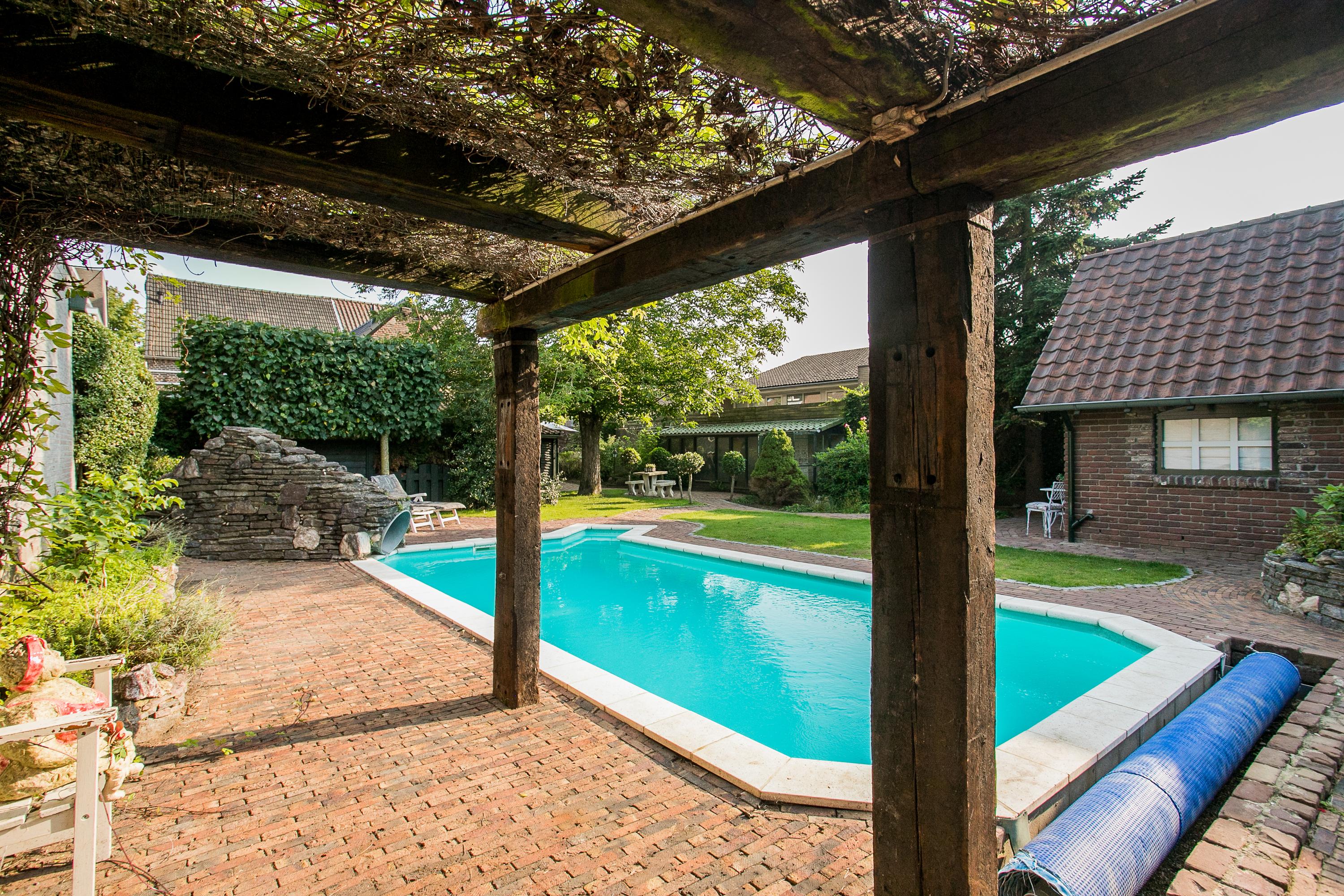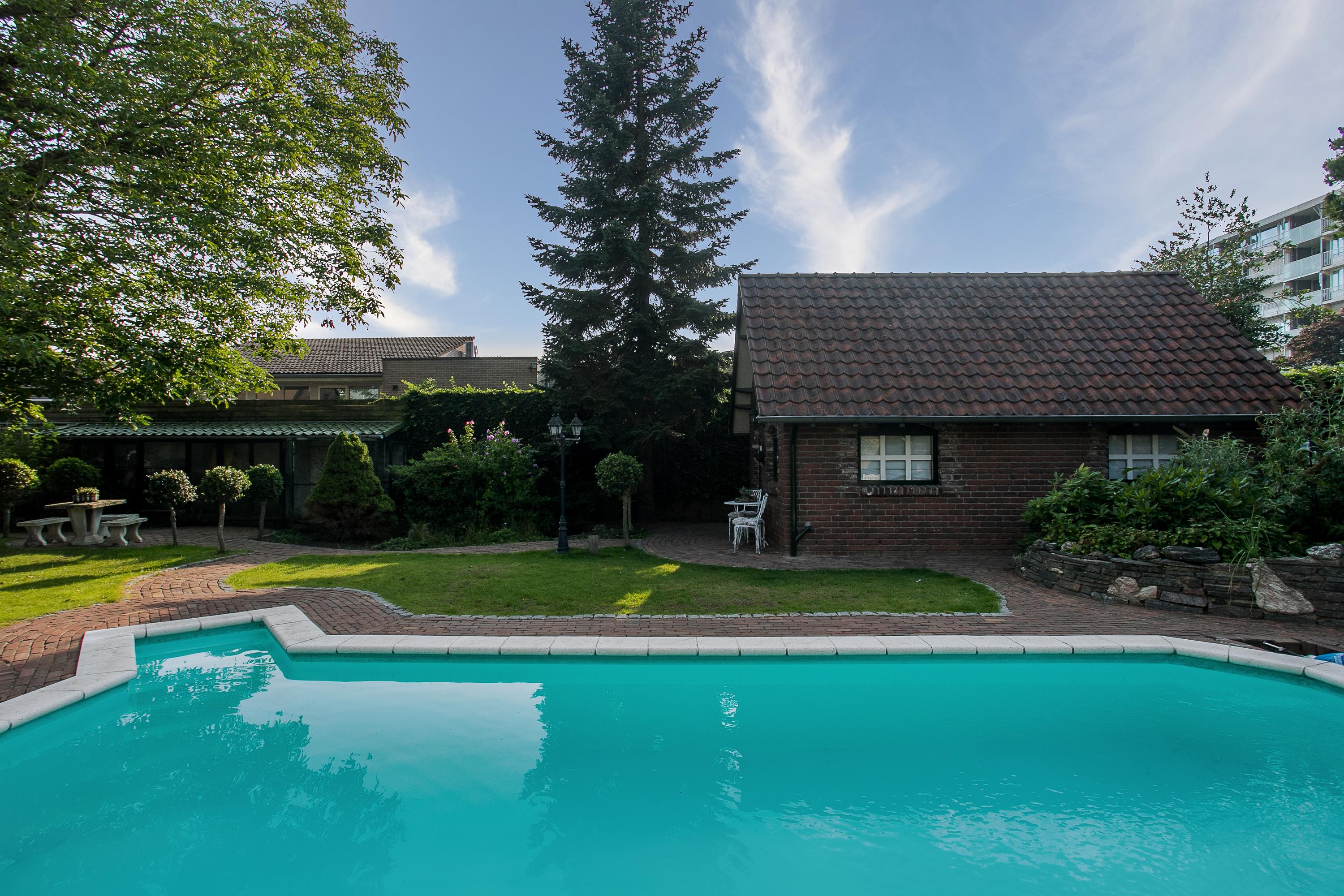 De tuin is prachtig, inclusief een zwembad, een loungeruimte en een bijgebouw dat nu als praktijkruimte en extra slaapkamer fungeert. Voor parkeren is er een carport met ruimte voor twee auto's. De woning heeft authentieke elementen, hoge plafonds en is goed onderhouden, met een woonoppervlakte van 197 m².