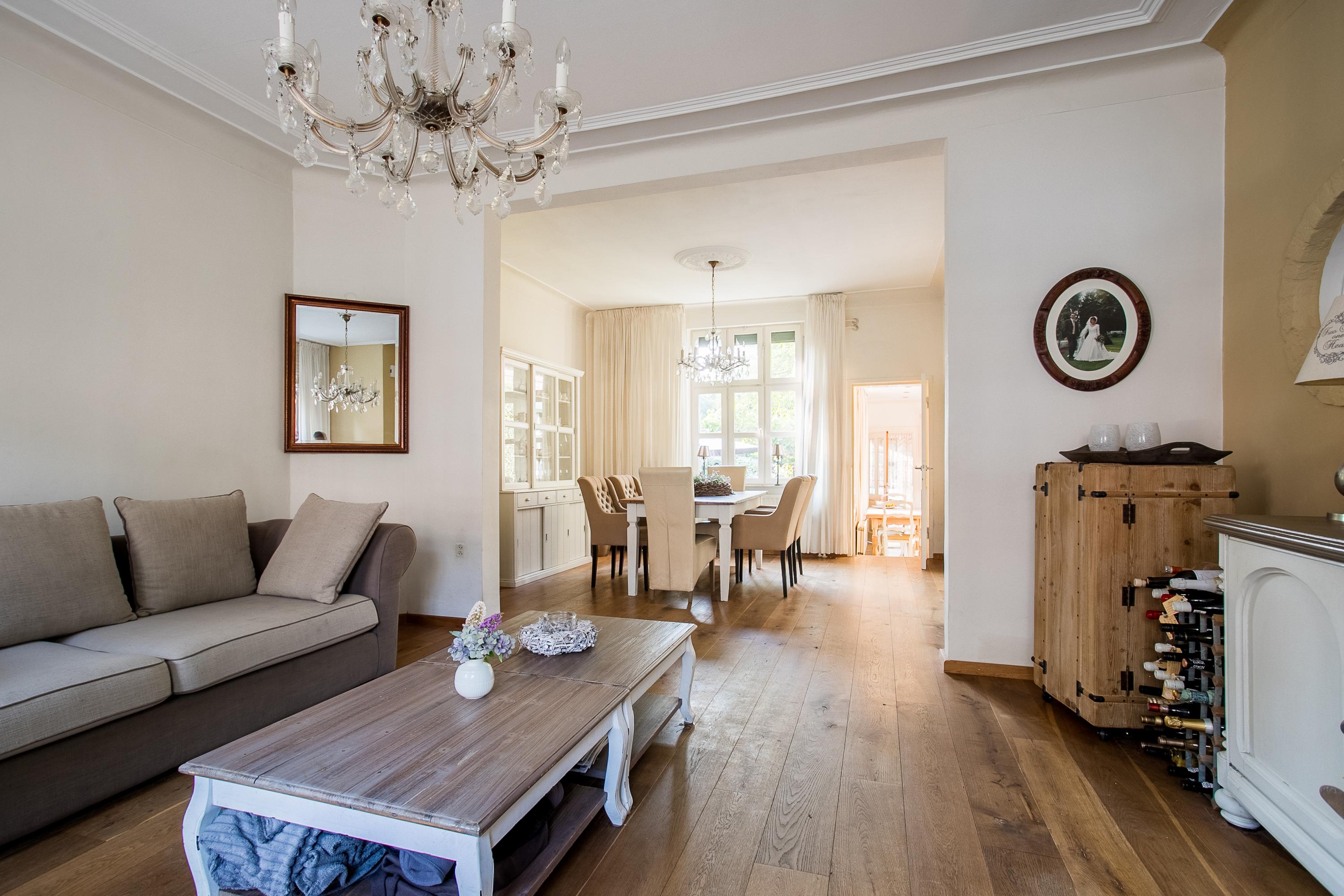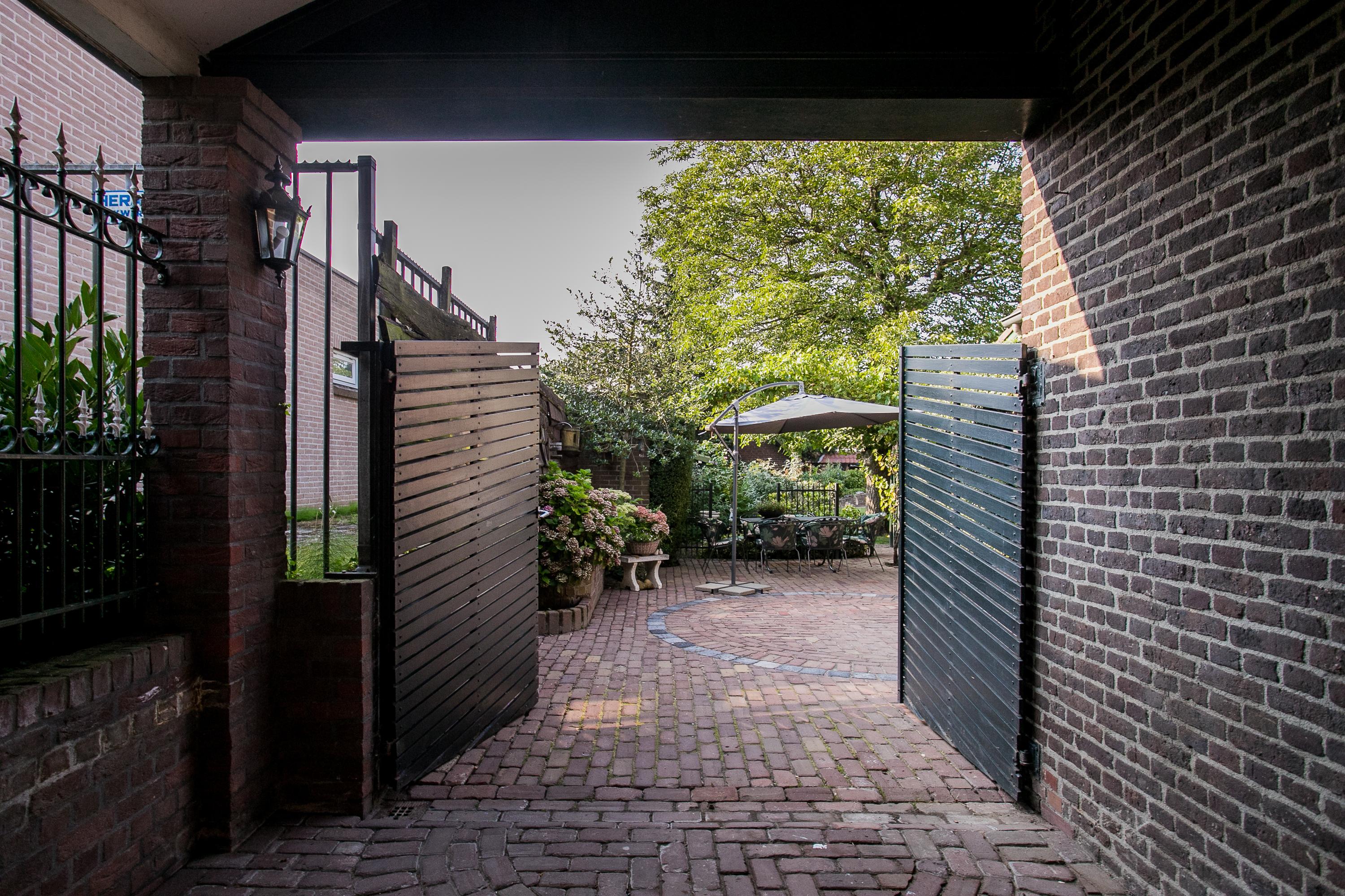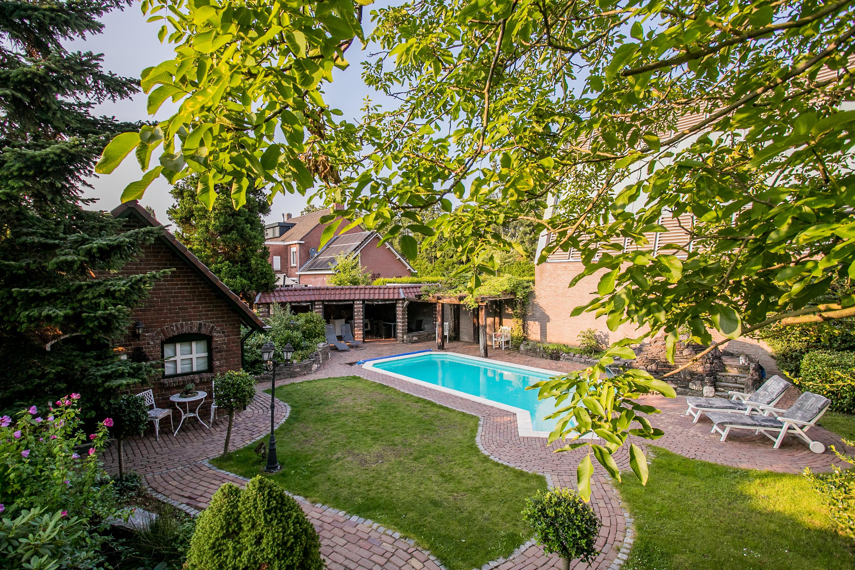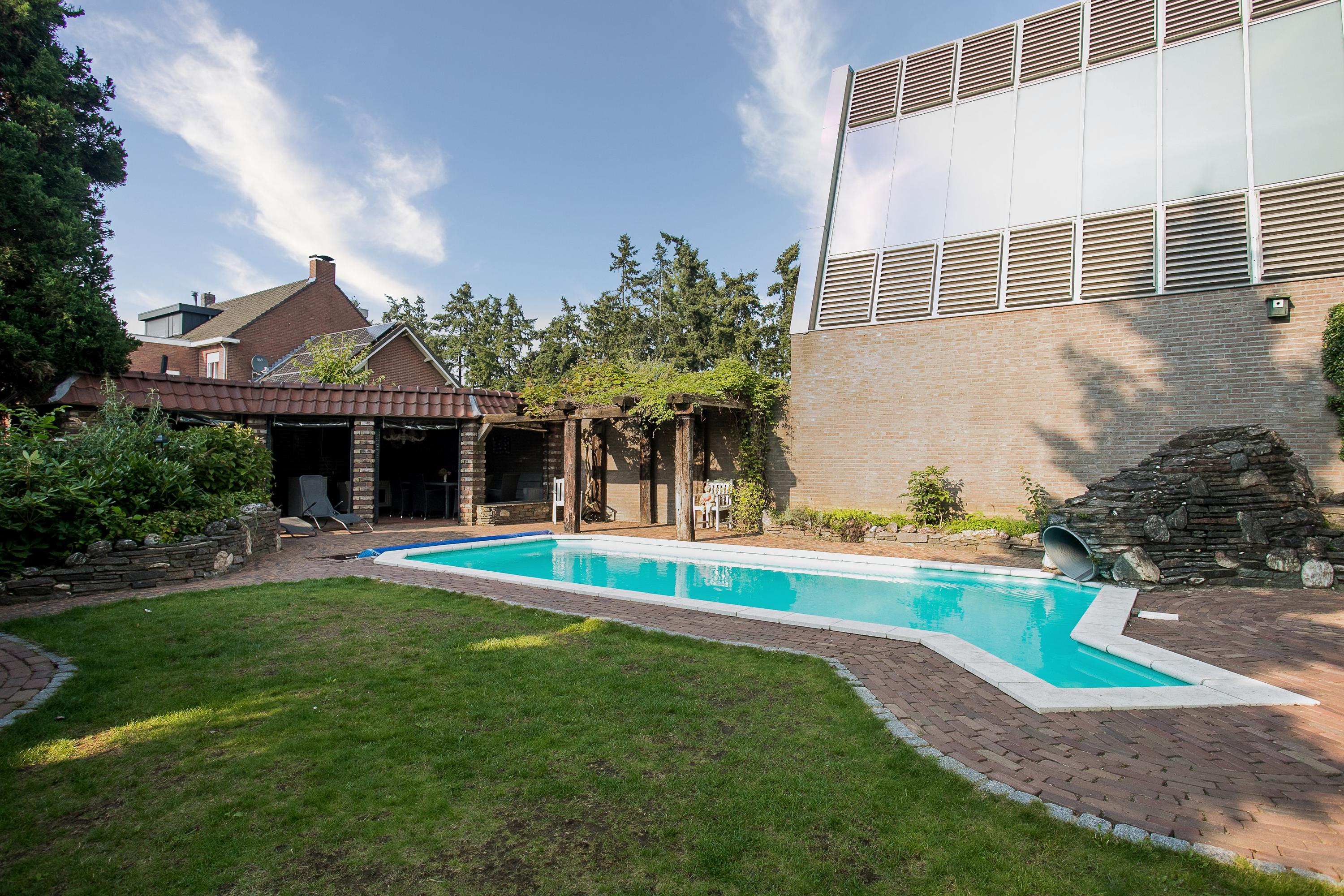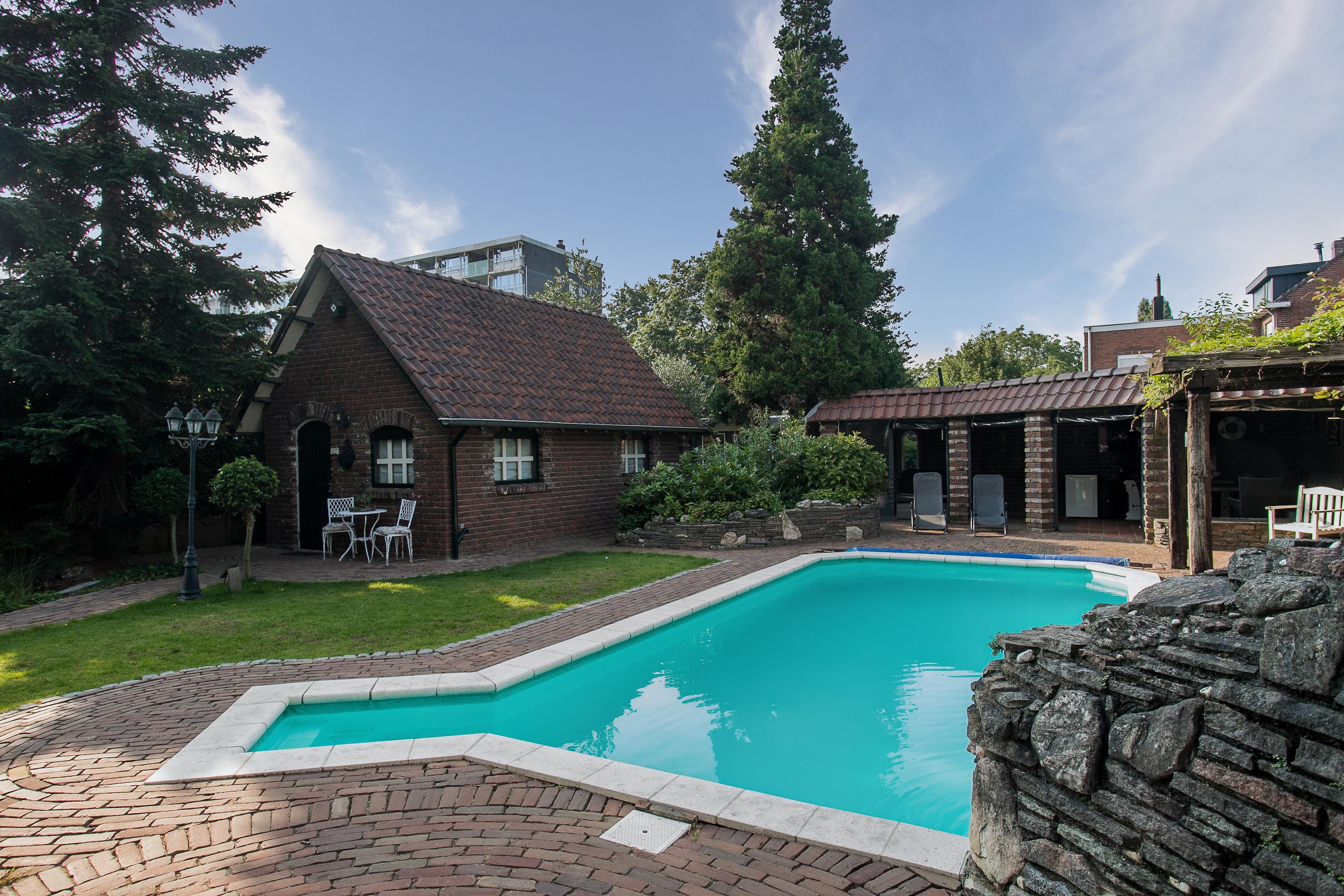 De tuin is prachtig, inclusief een zwembad, een loungeruimte en een bijgebouw dat nu als praktijkruimte en extra slaapkamer fungeert. Voor parkeren is er een carport met ruimte voor twee auto's. De woning heeft authentieke elementen, hoge plafonds en is goed onderhouden, met een woonoppervlakte van 197 m².