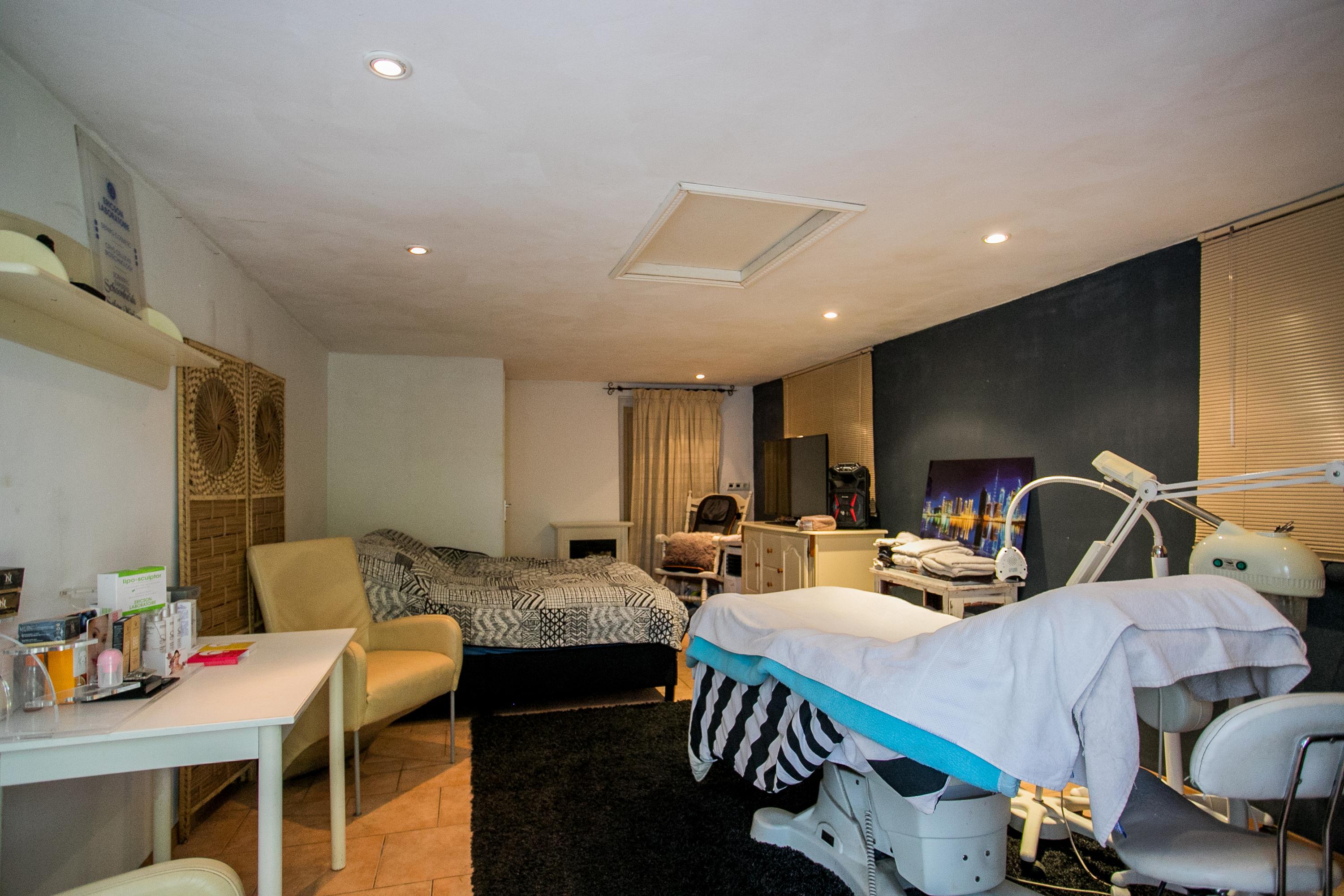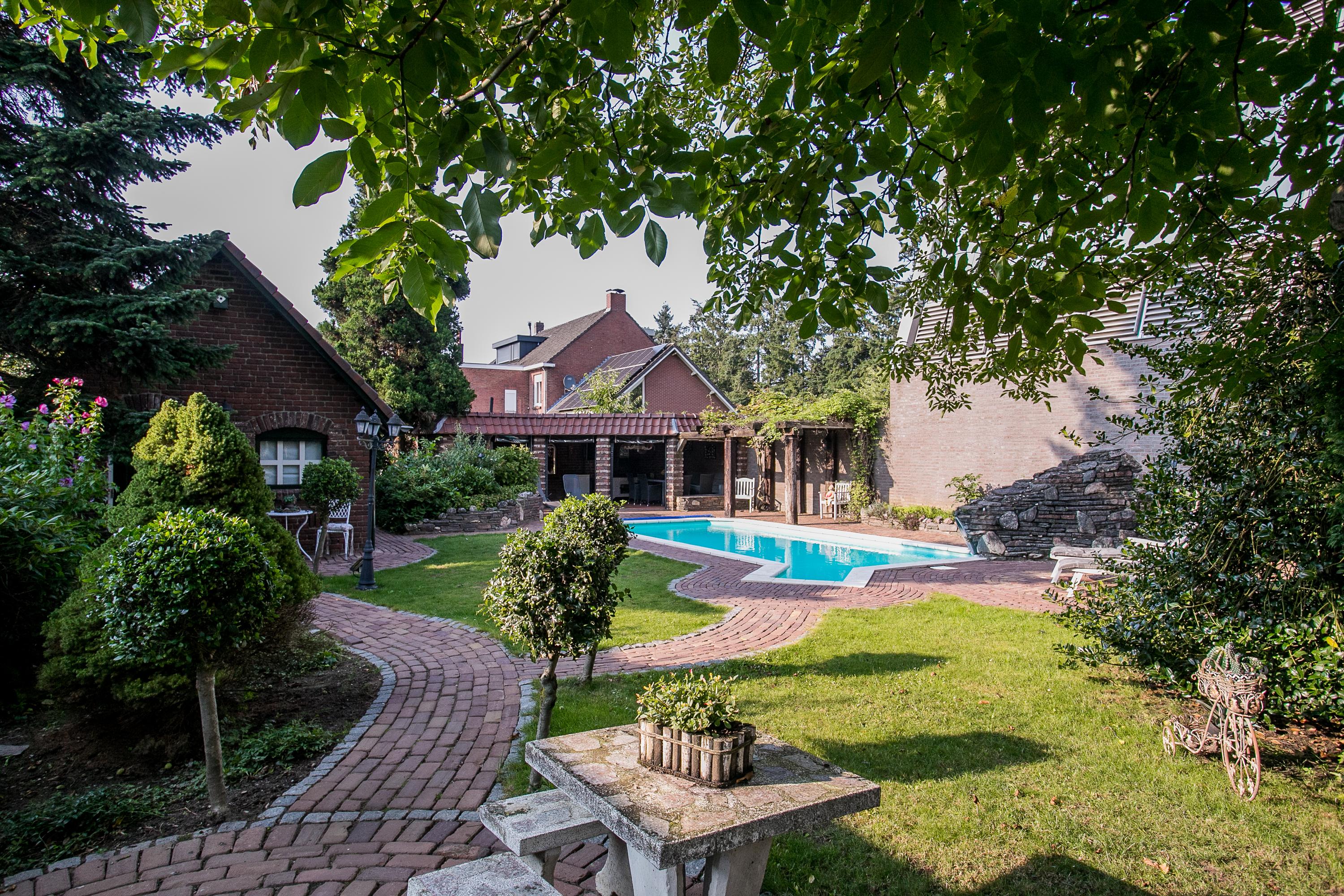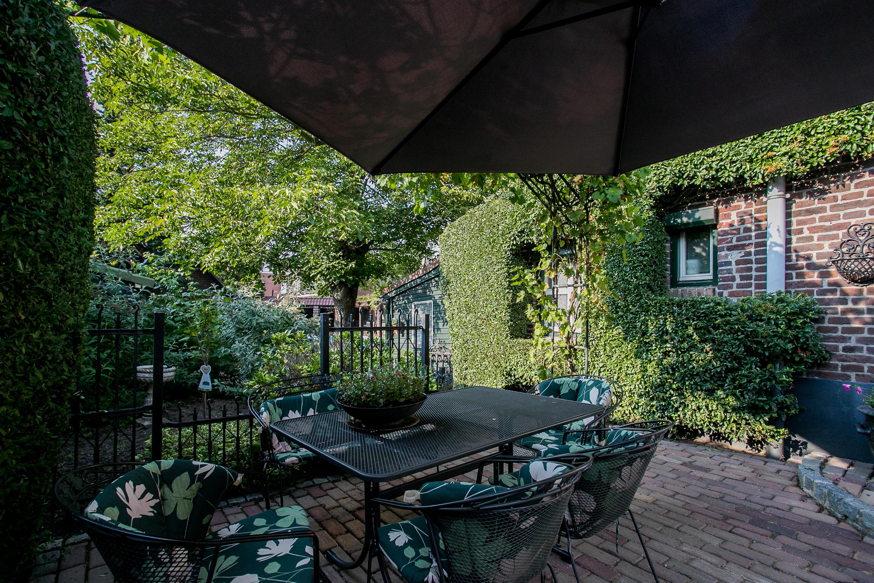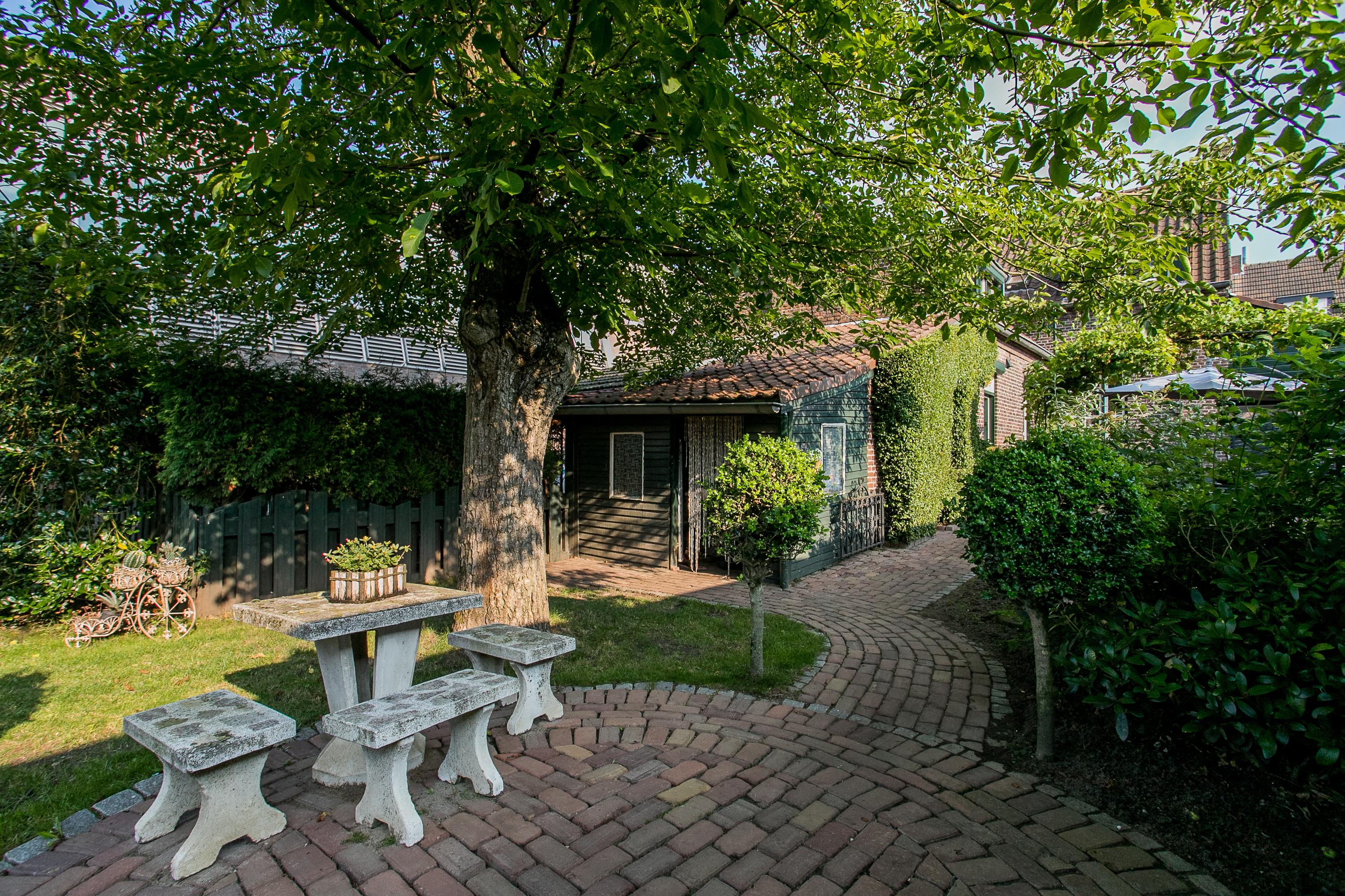 De tuin is prachtig, inclusief een zwembad, een loungeruimte en een bijgebouw dat nu als praktijkruimte en extra slaapkamer fungeert. Voor parkeren is er een carport met ruimte voor twee auto's. De woning heeft authentieke elementen, hoge plafonds en is goed onderhouden, met een woonoppervlakte van 197 m².