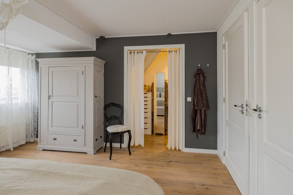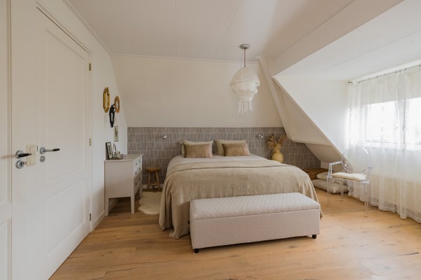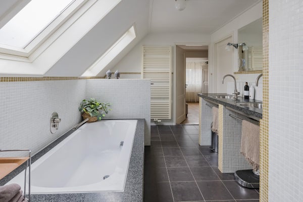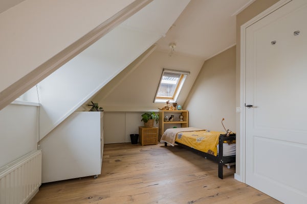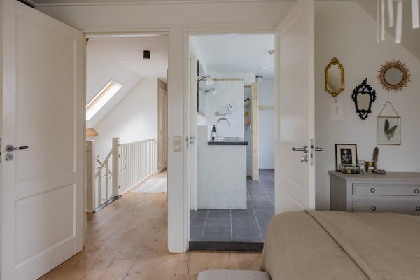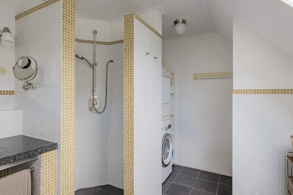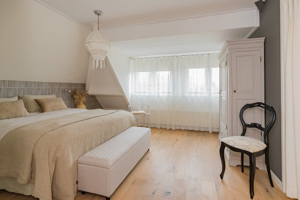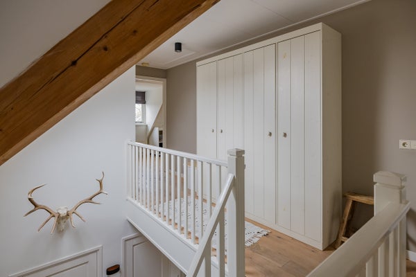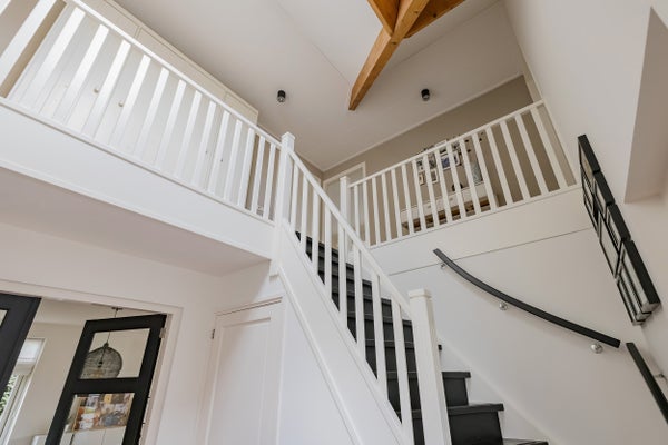 Op de eerste etage bevinden zich drie slaapkamers, waaronder een royale ouderslaapkamer met inloopkast en directe toegang tot de luxe badkamer met ligbad, dubbele wastafel in meubel, separate douche en een praktisch weggewerkte wasruimte. Vanuit de overloop is er een vlizotrap naar de royale bergzolder.