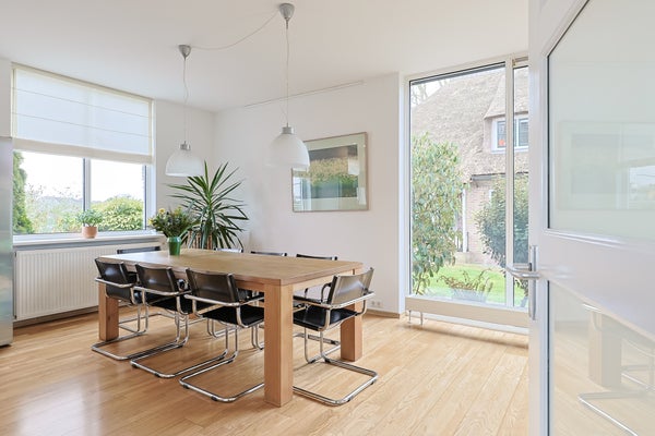Een praktische hal met bergkasten en een aparte wc leidt naar de U-vormige woonkamer die de tuin in een prachtig licht zet. Boven bevinden zich drie slaapkamers, een moderne badkamer met inloopdouche en een grote bergzolder.