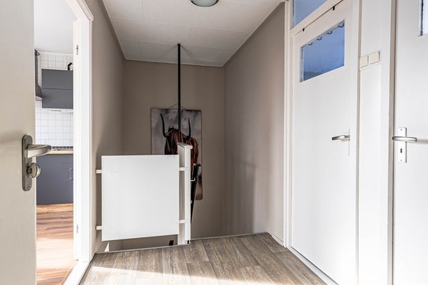 Entree/hal, meterkast, toiletruimte v.v. hangend toilet en fonteintje, vaste kast met wasmachine aansluiting, trapkast, overloop, keuken v.v. keukenblok diverse inbouwapparatuur: kookplaat, koelkast, oven en afzuigkap, woonkamer, badkamer v.v. douche en wastafel, slaapkamer met 2 vaste kasten, w.v. 1 met een HR-combi ketel, slaapkamer met deur naar het platte dak.