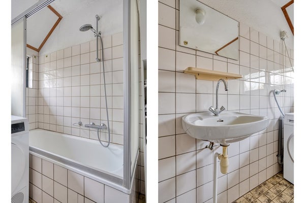De ruime badkamer is grotendeels betegeld en voorzien van een ligbad met douchescherm, duoblok toilet, wastafel, radiator, aansluitingen ten behoeve van de wasapparatuur en een raam voor natuurlijke ventilatie en daglichttoetreding. De badkamer dient gemoderniseerd te worden.