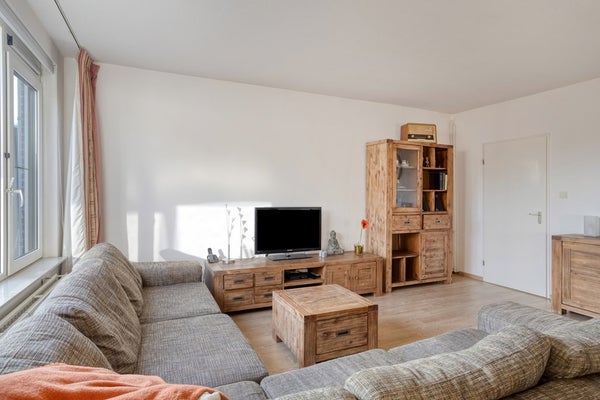 Gezellige woonkamer met laminaatvloer en open houten trap naar de eerste verdieping. Vanuit de woonkamer toegang tot de keuken en een tochtportaal.