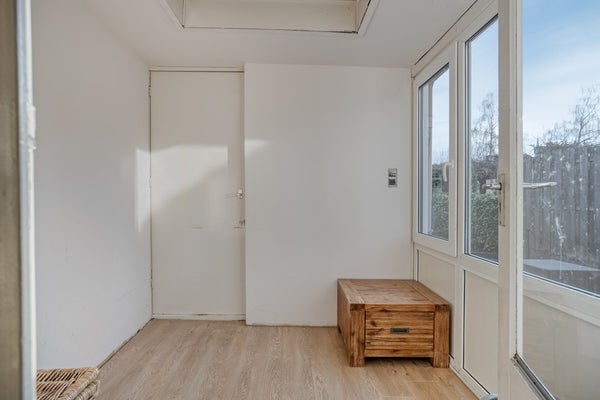 Via dubbele openslaande deuren toegang tot het tussenportaal. Het portaal is voorzien van een laminaatvloer, een lichtkoepel, een raam en loopdeur naar de berging.