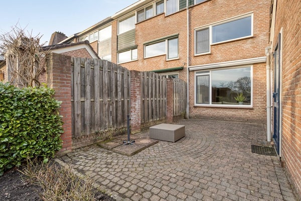 De zonnige, onderhoudsvriendelijke en privacy biedende achtertuin (ca. 14,50 x 6 m.) is voorzien van sierbestrating, diverse borders met meerjarige beplanting en een groot terras, grenzend aan de achtergevel met een hand bedienbaar zonnescherm. Aan de achterzijde van de tuin een poort naar de achtergelegen brandgang met aansluitend een speelveld en fiets-/wandelpaden.