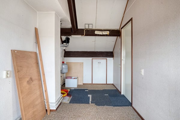 Slaapkamer V heeft spachtelputz wanden, deels houten plafondafwerking en bergruimte achter de knieschotten. Hier bevindt zich tevens de opstelplaats van de c.v. combiketel (Remeha Avanta 2013).