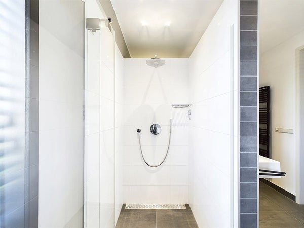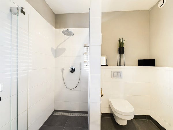 Deze badkamer is uitgerust met een hangtoilet, wastafelmeubel en douche en voorzien van vloerverwarming.