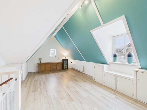 De tweede verdieping is bereikbaar middels een vast trap. Door middel van twee mooie houten klapdeuren is de ruimte gescheiden in twee delen. Het voorste gedeelte kan gebruikt worden als slaapkamer of hobbyruimte. Door de dakkapel is de zolder extra licht en ruim en geeft zelfs de mogelijkheid om deze nog op te delen in twee slaapkamers. Achter de houten deuren bevindt zich de technische ruimte met de warmtepomp en de aansluiting voor de wasmachine.
