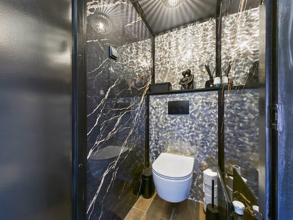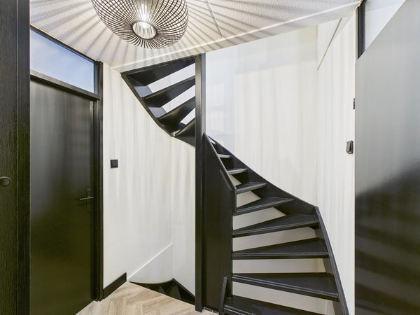 De eerste verdieping beschikt over drie slaapkamers en een nette badkamer. Ook hier is de hotel chique afwerking met visgraatvloer en zwarte accenten consequent doorgevoerd, wat zorgt voor een luxe en rustige uitstraling. Eén van de slaapkamers is ingericht als walk-in closet, ideaal voor extra comfort en opbergruimte. De badkamer is compleet uitgevoerd met een douche, toilet en wastafelmeubel.