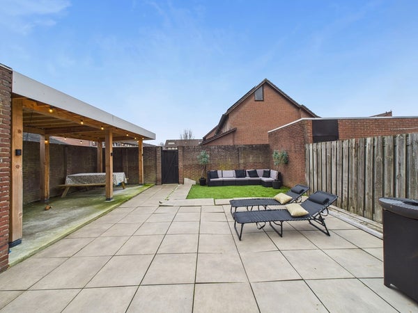 Op de verdiepingen bevinden zich vier ruime slaapkamers en een verzorgde badkamer, wat deze woning zeer geschikt maakt voor gezinnen. Buiten geniet je van een ruime tuin met overkapping, ideaal om in alle rust te ontspannen of gezellig samen te zijn.