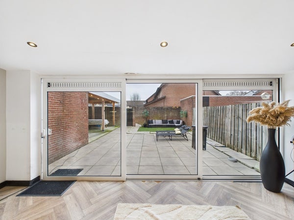 Inkomhal met toegang tot het toilet, de meterkast en de woonkamer. De stalen deur met glas geeft al een doorkijkje naar de hotel chique woonkamer. De gezellige woonkamer is voorzien van een visgraat vloer en beschikt over een cinewall met hieronder een sfeerhaard. Aansluitend bevinden zich de ruime eethoek en moderne keuken. De keuken is voorzien van alle benodigde inbouwapparatuur zoals inductiekookplaat met geïntegreerde afzuiging, Quooker kraan, een oven, vaatwasser en koelkast. De aangebouwde serre zorgt voor extra wooncomfort en veel lichtinval, waardoor binnen en buiten mooi in elkaar overlopen. Daarnaast beschikt de woning over een garage met aangrenzende bijkeuken, wat zorgt voor extra bergruimte en praktisch gemak.